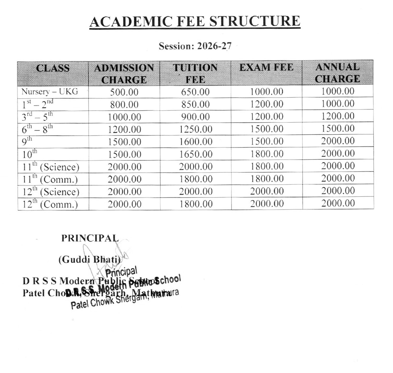 The fee structure of D.R.S.S Modern Public School, for the academic year is as follows: